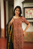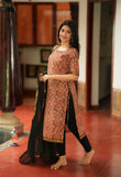 Elevate your everyday elegance with this charming pink stitched handloom kurta set. Crafted from pure handloom fabric, this ensemble is a beautiful blend of simplicity, tradition, and comfort. The kurta features a soft round neckline adorned with delicate fabric Potli detail, paired with elbow-length sleeves and subtle side slits for ease. The matching straight-fit pants and a handwoven dupatta with classic stripes and tassel ends complete the graceful look. Whether you're heading to a casual outing or a festive family gathering, this piece radiates effortless South Indian charm.