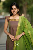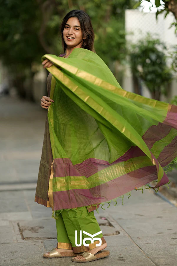 Turn heads with this stunning handloom straight-cut kurta set, blending tradition with modern grace. The kurta features a rich dual-tone weave of olive green and mauve with a touch of golden zari on the neckline and borders, giving it a festive charm. Paired with a vibrant green bottom and a coordinated dupatta featuring golden stripes and tassel detailing, this set is perfect for ethnic outings or elegant day events. Soft, breathable fabric ensures all-day comfort with timeless flair.
