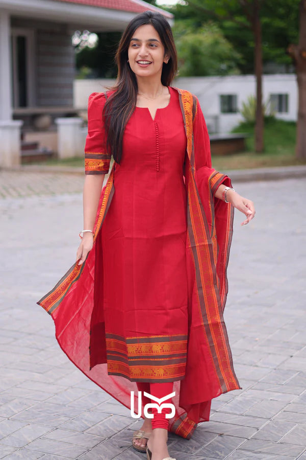 Are you looking for the best formal outfit? Then, you can look at the most perfect and comfortable Handloom kurta set. This Rushika Kurta set is 100% pure, vibrant red handloom with a matching dupatta, and is designed to detail the neckline and borders. The dupatta has a beautiful pattern and a traditional ethnic design on the golden border, adding a touch of casual comfort. The outfit strikes a perfect look for formal occasions. This Kurta set includes the kurta and dupatta only, but you can pair it with your matching leggings or pants to complete the look.
