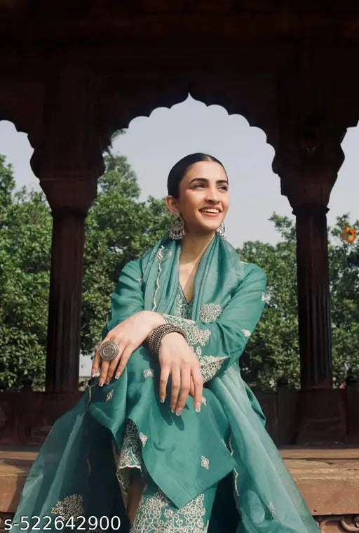 Floral Embroidered Regular Thread Work Straight Kurta with Palazzos & Dupatta